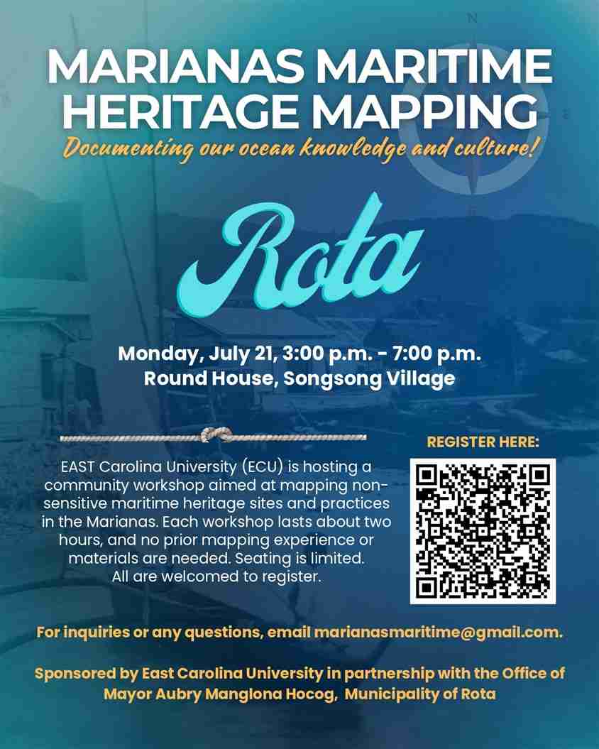 Monday July 21 - There will be a "Marianas Martitime Mapping Workshop" to be held at the Rota Round House from
